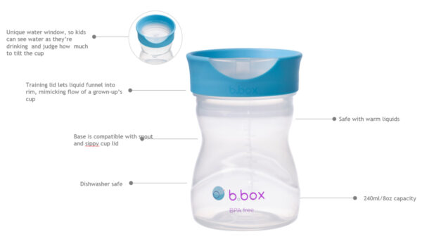 The b.box training cup is perfect for teaching to drink from an open cup. It mimics the flow of an open cup with greater control and less mess, by funneling liquids into the rim for easy free-flow drinking. The cup also features a unique water window in the lid so children can learn to see water as they’re drinking and judge how much to tilt their cup. The interchangeable base and lid allows a switch between the spout, sippy cup and training lids as babies and children grows.